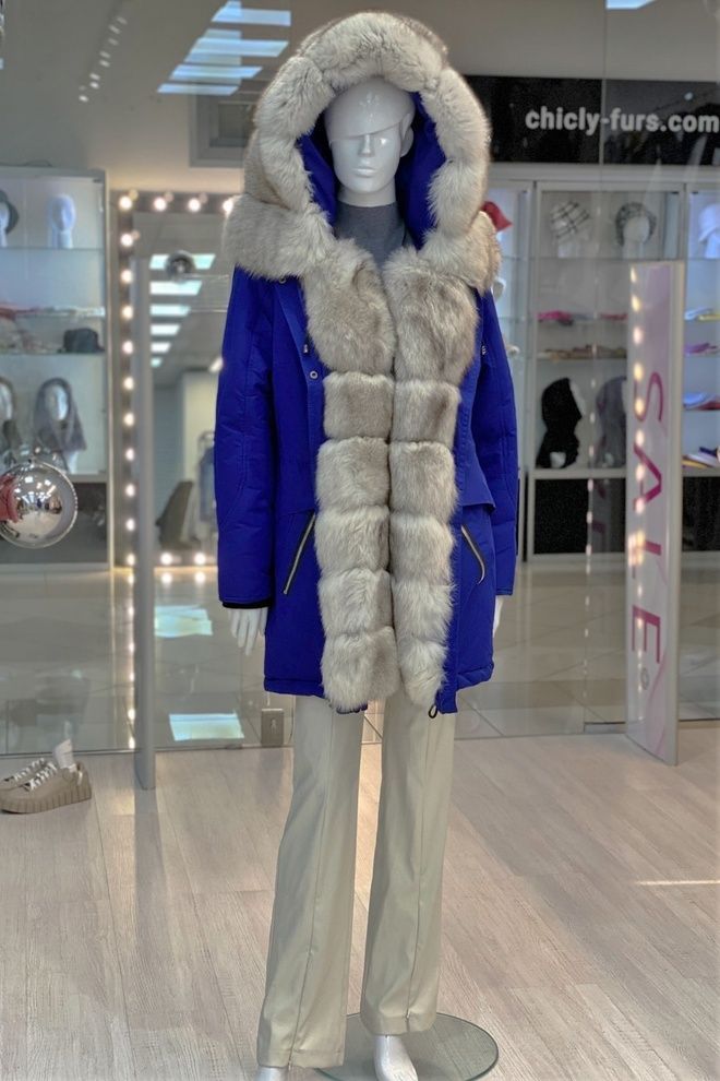 Парка из плащевки с отделкой песцом (синий+вуаль)