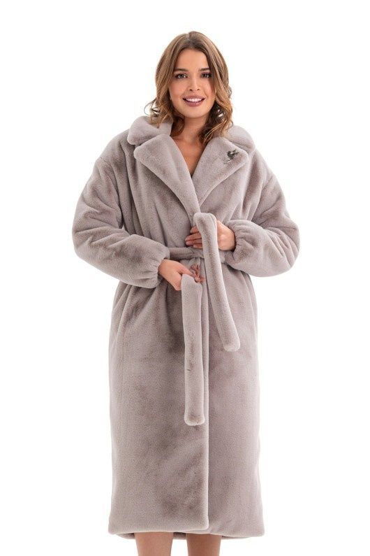 Воротник изделия отложной. Его украшает красивая брошь. По желанию, воротник можно закрыть на потайную пуговицу. Есть карманы в боковых швах. Шуба из эко кролика, утепленная слимтексом, шикарно смотрится с поясом.